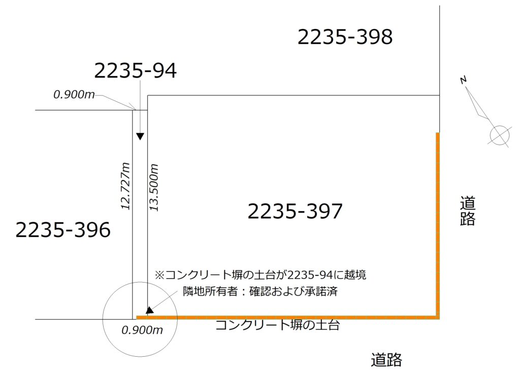 ・ブロック塀土台が隣地(2235-94 11.45㎡)に越境しています※隣地土地所有者の「境界確認書」取得済み